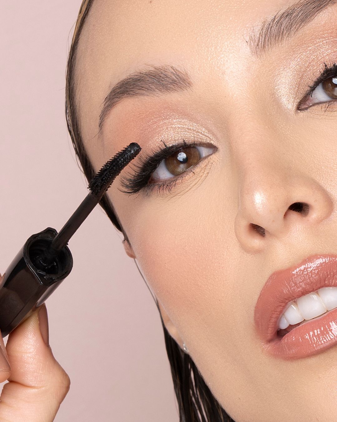 1. Coloca el cepillo en la base de las pestañas y haz un movimiento en zigzag mientras subes hasta las puntas. Esto ayuda a separar, dar volumen y evitar grumos. Puedes aplicar una segunda capa antes de que la primera se seque completamente para lograr un efecto más dramático.